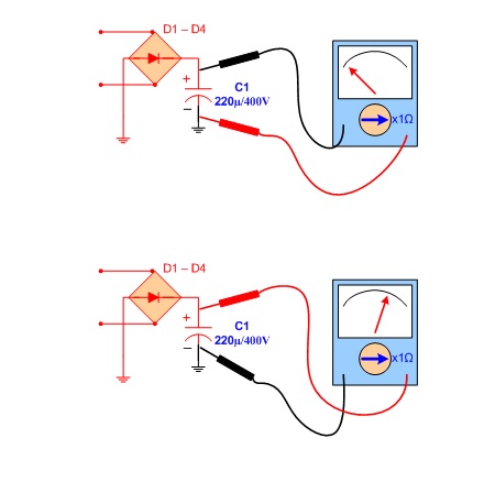 Đo vào hai đầu tụ lọc nguồn, đảo que đo hai chiều, nếu kết quả một chiều đo kim không lên, một chiều đo kim lên như ở trên là trở kháng bình thường .