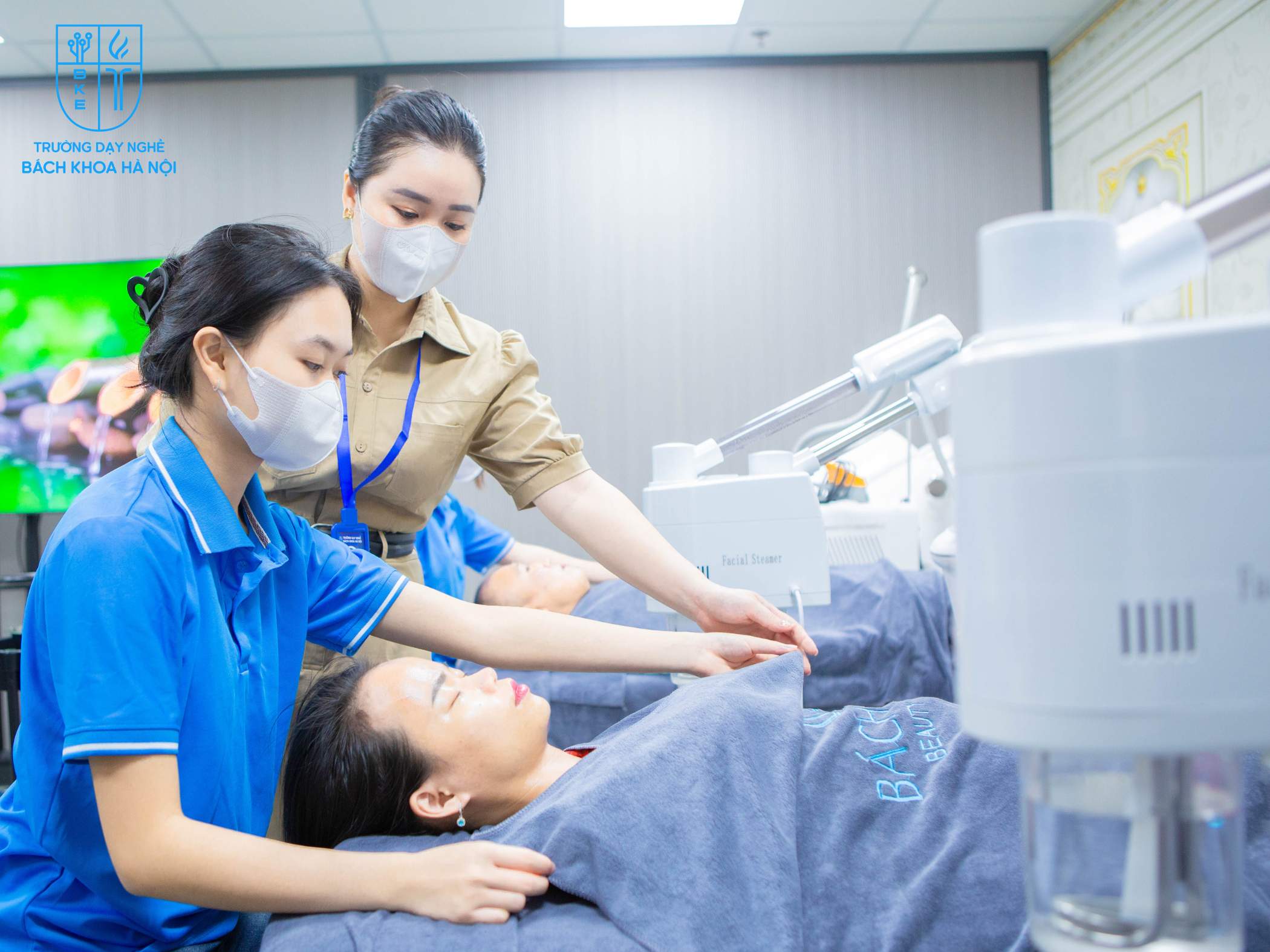 Để đáp ứng nhu cầu thực hành cao, Bách Khoa Beauty Academy đã đầu tư một hệ thống trang thiết bị hiện đại, đồng bộ và được cập nhật liên tục. Các phòng thực hành được trang bị đầy đủ các loại máy móc, dụng cụ chuyên dụng như máy móc làm sạch da, máy soi da, máy xông hơi, máy tắm trắng…