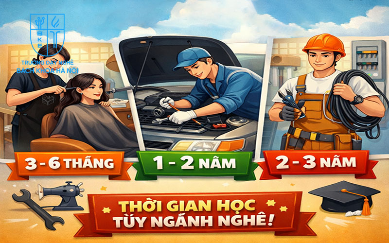 Thời gian học tỷ lệ thuận với độ khó của nghề. Các nghề kỹ thuật phức tạp liên quan đến cơ khí, điện công nghiệp.. cần tính tỉ mỉ và an toàn cao. Do đó, thời lượng đào tạo kéo dài hơn so với nghề dịch vụ thẩm mỹ vốn chú trọng sự khéo léo của đôi tay.